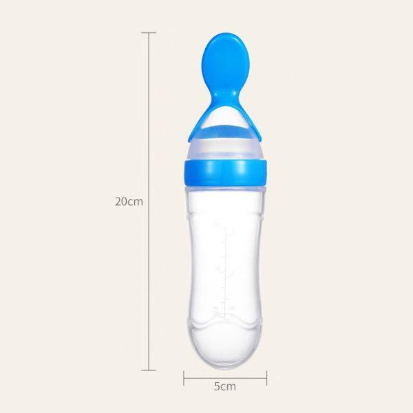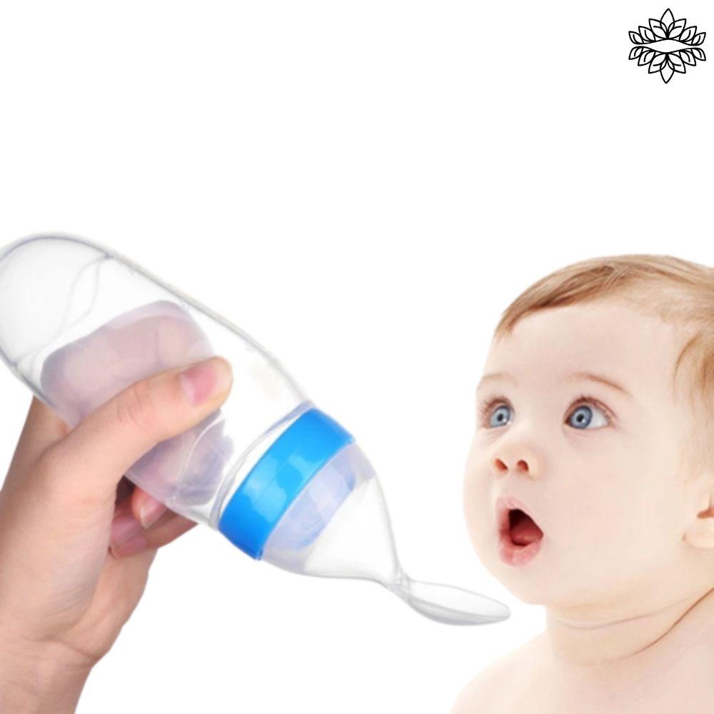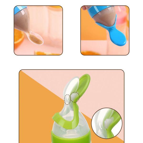 Você só precisa encher a garrafa com comida e pronto. Ela é feita de silicone macio e confortável e pode ser usada para alimentar o bebê com leite, sucos, purê, sopas e outros alimentos líquidos.